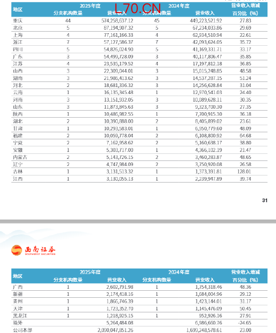 “一域独大”的格局,既体现了西南证券深耕重庆多年的区位优势——作为当地唯一法人券商,公司深度融入成渝地区双城经济圈建设等重大战略;但同时也意味着公司业绩与川渝地区经济发展高度绑定,区域经济波动可能对公司形成较大影响。