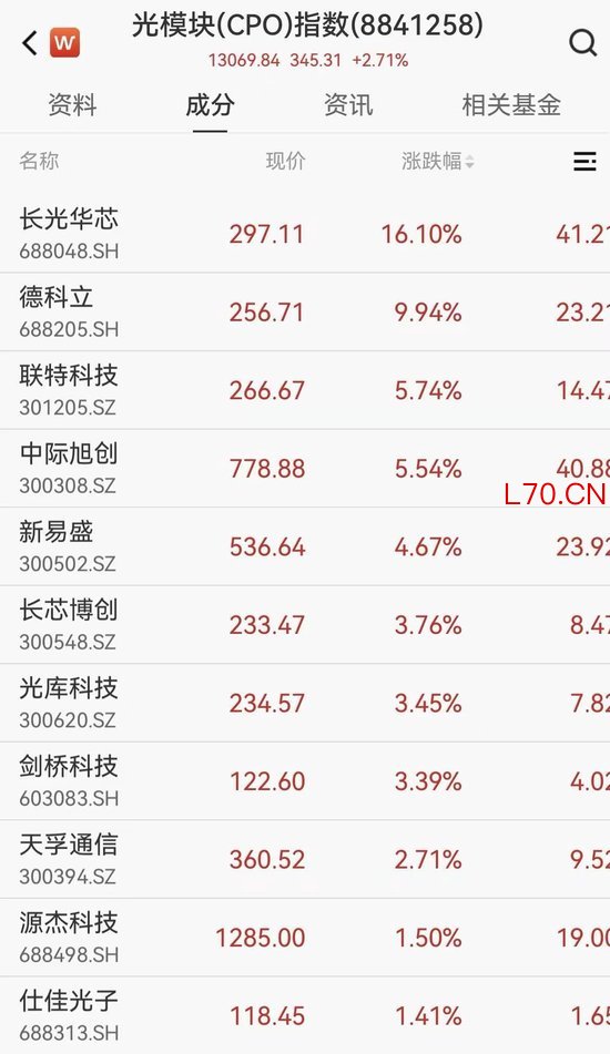 4月14日,CPO概念震荡拉升,截至10时34分,长光华芯涨超16%续创历史新高,德科立涨超9%,剑桥科技、胜宏科技、汇绿生态、光库科技跟涨。