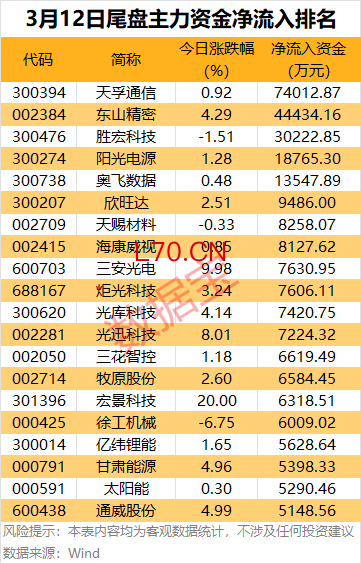 个股方面,天孚通信(300394)、东山精密(002384)、胜宏科技(300476)尾盘主力资金大幅净流入金额均超3亿元。阳光电源(300274)、奥飞数据(300738)尾盘主力资金大幅净流入均超1亿元。