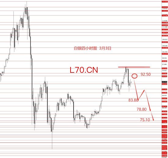 白银上周正如预期震荡上行,但黄金到达了5320,白银也只到达95.50区域。昨日同时承压回落,白银昨日收阴柱。从图形来看,白银小顶部出现,今日激进者可进场做空白银,操作建议:92.50-91.20区域做空,止损96.50,目标看向83.80和80.70和78.80,若力度较大再关注75.10区域。控制仓量,严格止损。