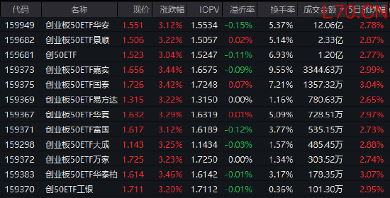 3月10日,三大指数集体反弹,深成指涨超2%,创业板指涨超3%。在此背景下,创业板50ETF华安(159949)大涨3.12%,报收1.551元,全天换手率5.37%,成交额达12.06亿元,成交规模居同类标的ETF首位。