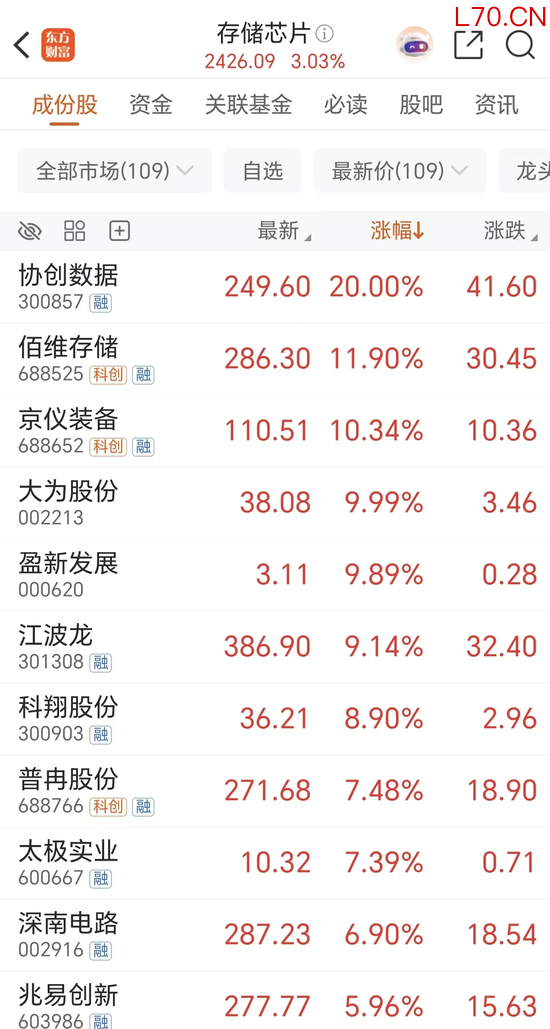 周二(4月14日)存储芯片概念股走强,截至午间收盘,协创数据20CM涨停,佰维存储、京仪装备等涨超10%。