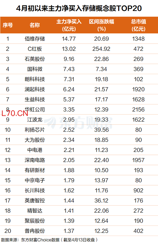 东方财富Choice数据显示,自今年4月初以来,主力资金抢筹了一批存储概念股。具体来看佰维存储排名第一,主力净买入15亿元;C红板排名第二,主力净买入超13亿元。