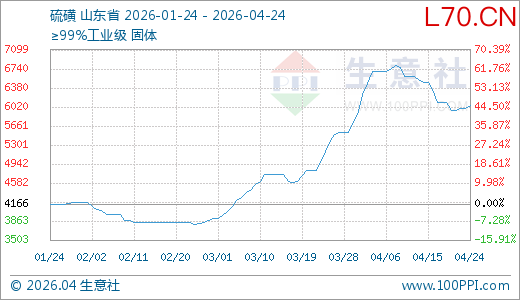 04月24日硫磺6050.00元/吨 30天上涨12.38%