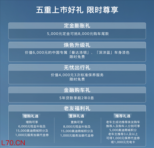 权益方面,5000元定金可抵8000元购车尾款;价值6000元的中国专属曼达洛银、深洋蓝车身漆色限时免费;价值4000元的3次标准保养服务等。