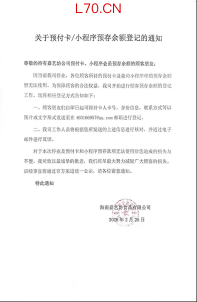 而部分品牌虽然已经在推进预存余额确权的工作,但并无具体方案与时间表。比如近日,海南嘉艺坊在企业公众号及部分门店张贴通知,正式启动预付卡及预存余额登记工作,消费者可将持卡人卡号、身份信息、联系方式等资料发送至指定邮箱完成登记,经工作人员核对后再通过邮件反馈结果。