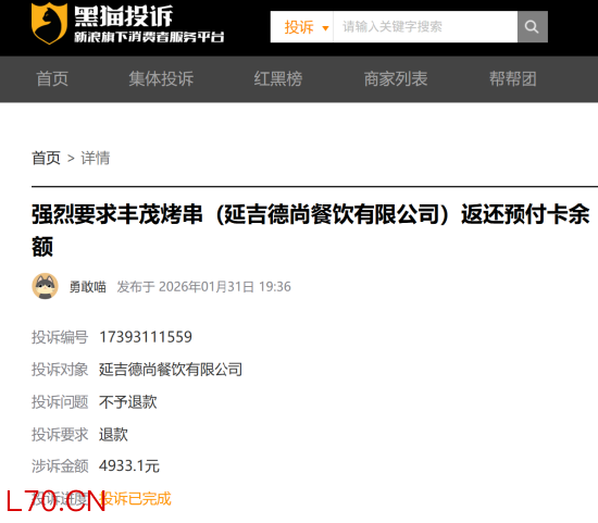 同时,靳女士还被告知,之前办理的储值卡已经不能在仅有的门店通用。随后,靳女士申请办理储值卡退卡,门店受理并同意半月后退卡,同时丰茂烤串总部即延吉德尚餐饮有限公司也将其会员卡里的余额全部清零,但一个月后依然未成功退款。