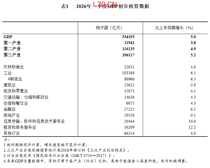 一季度国内生产总值为334193亿元,按不变价格计算,同比增长5.0%,比上年四季度加快0.5个百分点。
