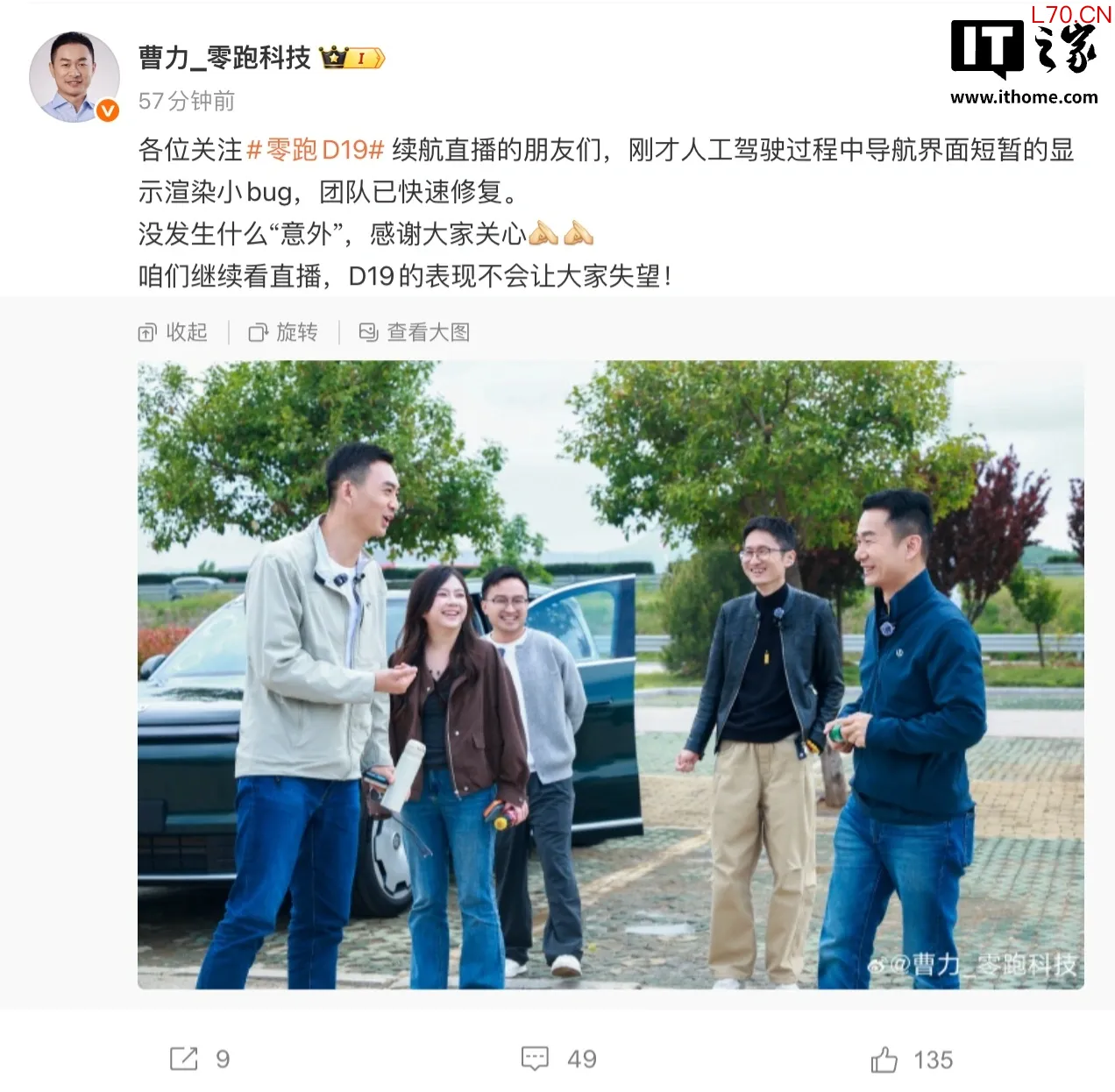 零跑高级副总裁曹力回应 D19 车型直播中导航界面出现 bug:已快速修复
